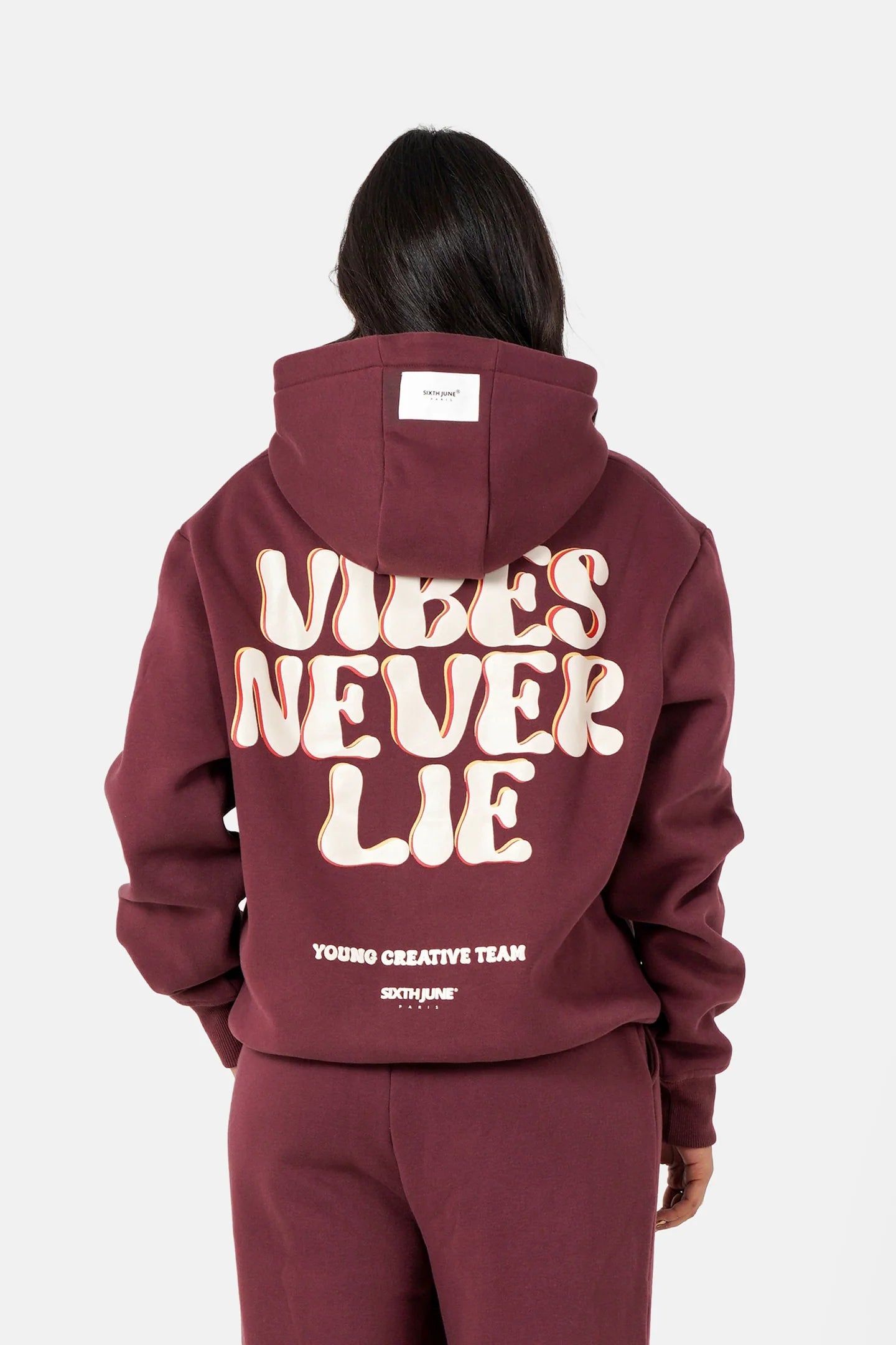 Confectionné dans une matière douce et chaude, cet ensemble offre une coupe oversize parfaite pour les journées cocooning ou les sorties en ville. À l’arrière, l’inscription « Vibes Never Lie » apporte une note d’attitude et d’énergie positive.