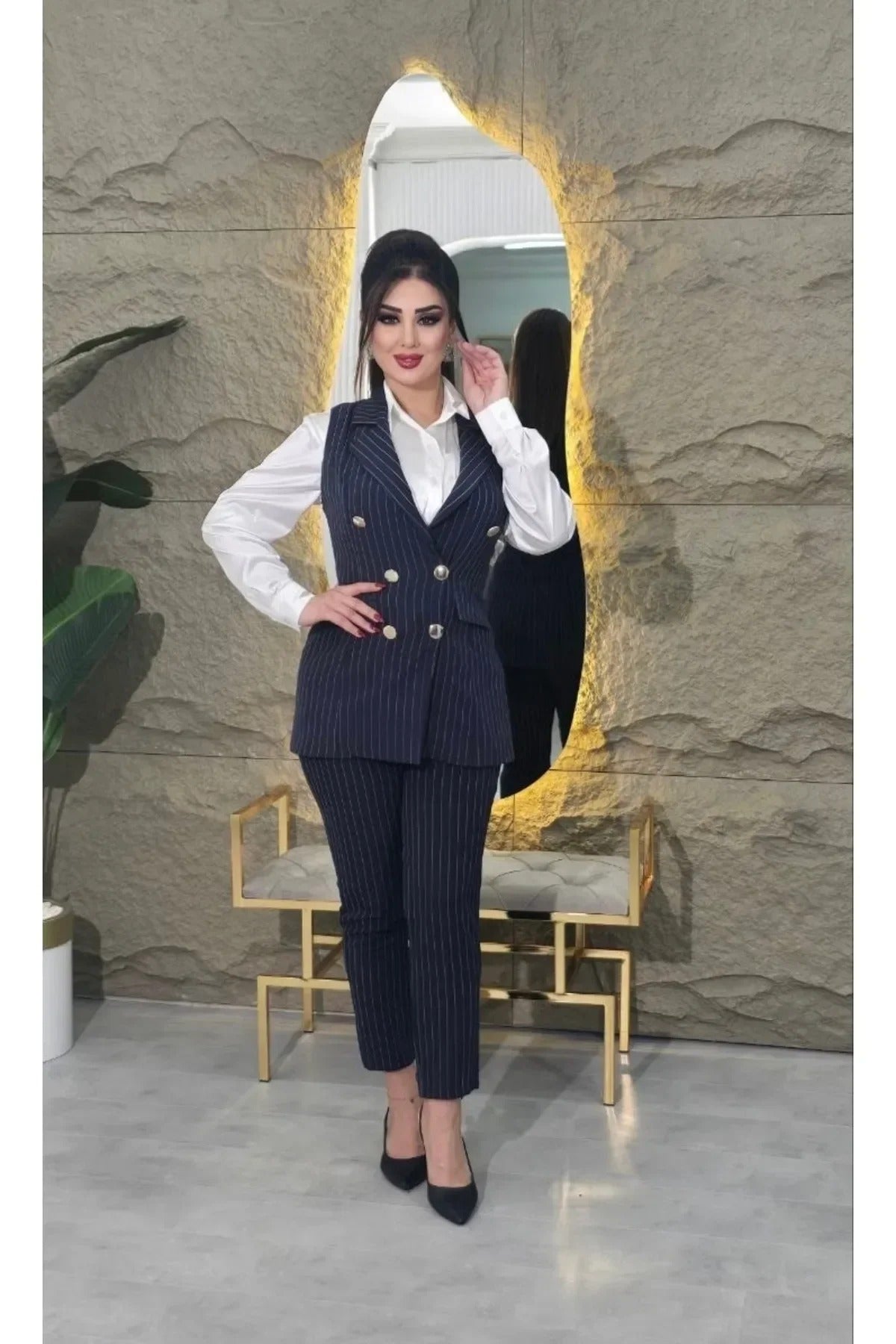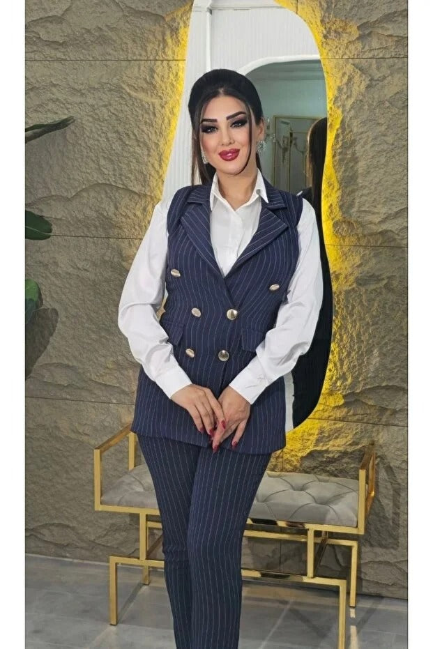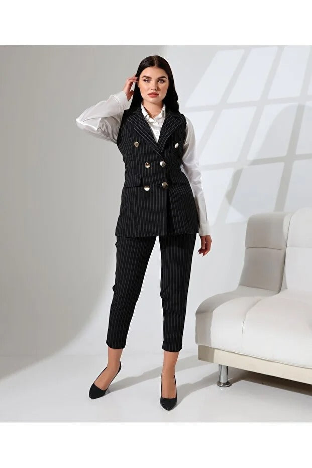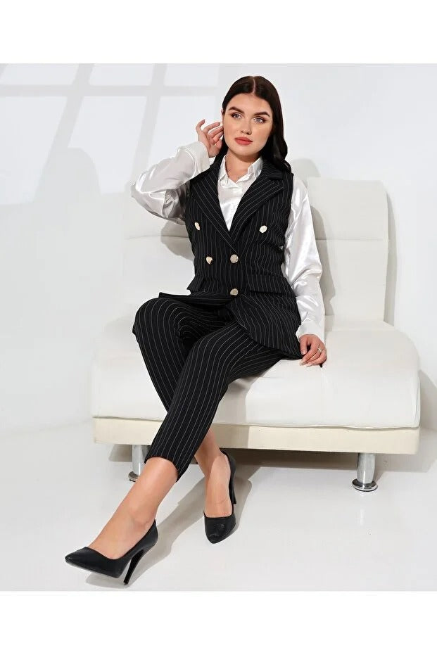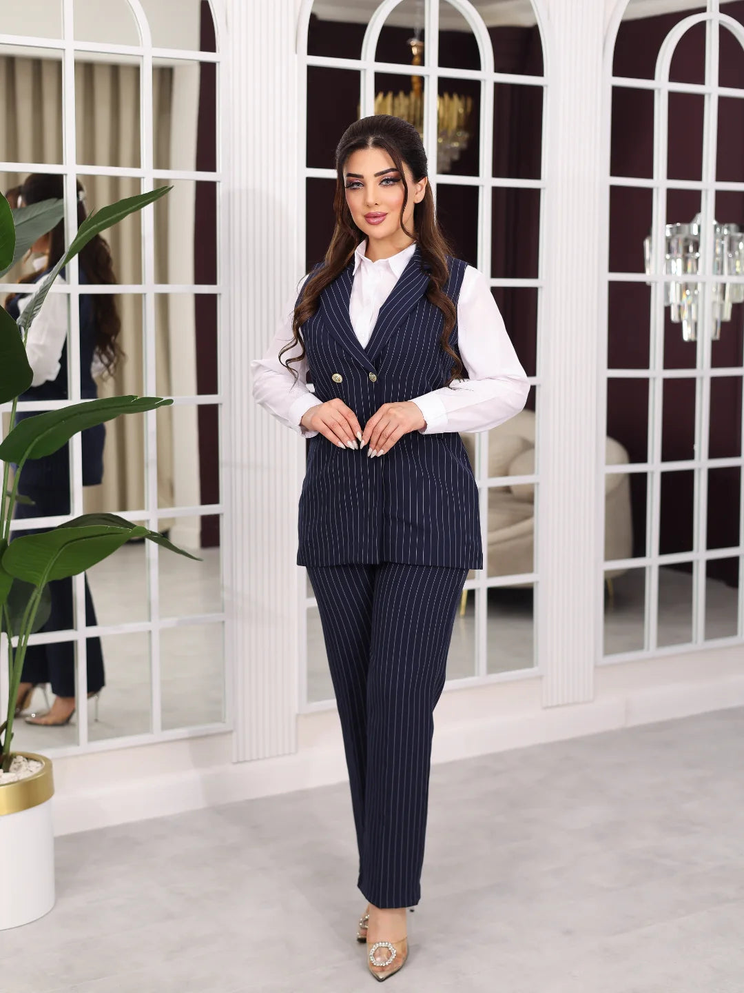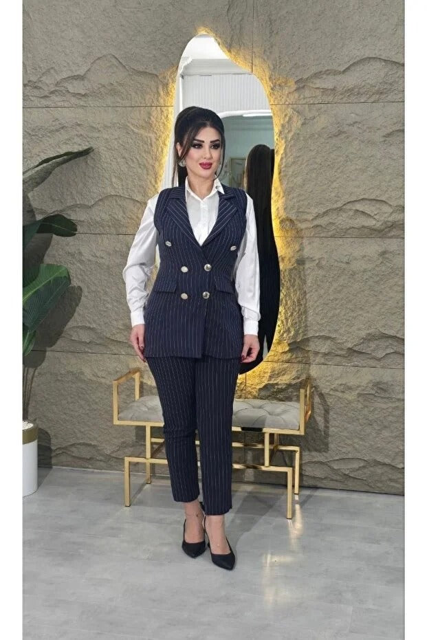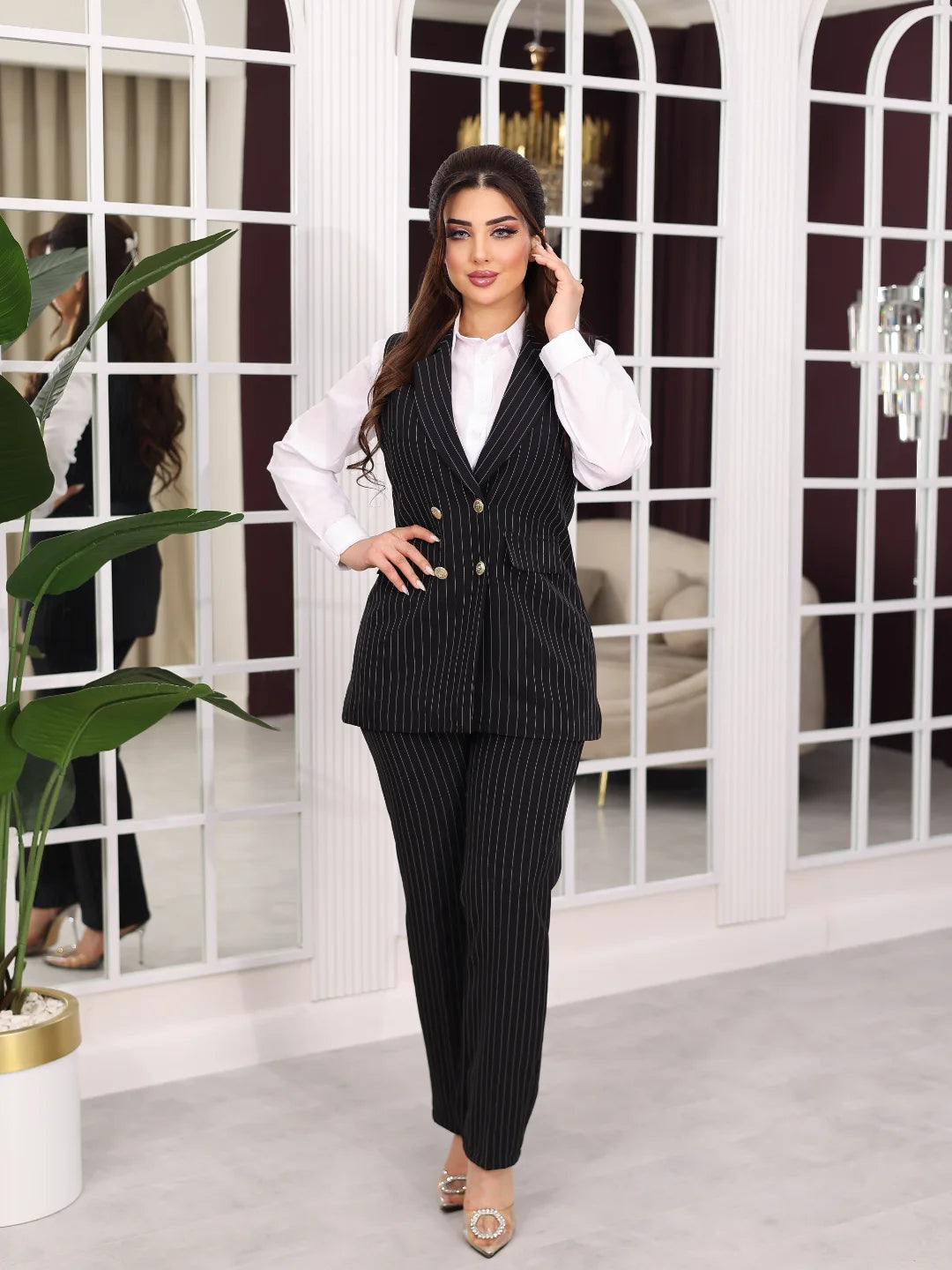 Un ensemble tailleur rayé au style audacieux, composé d’un pantalon parfaitement ajusté et d’un gilet chic qui redéfinit la féminité moderne.