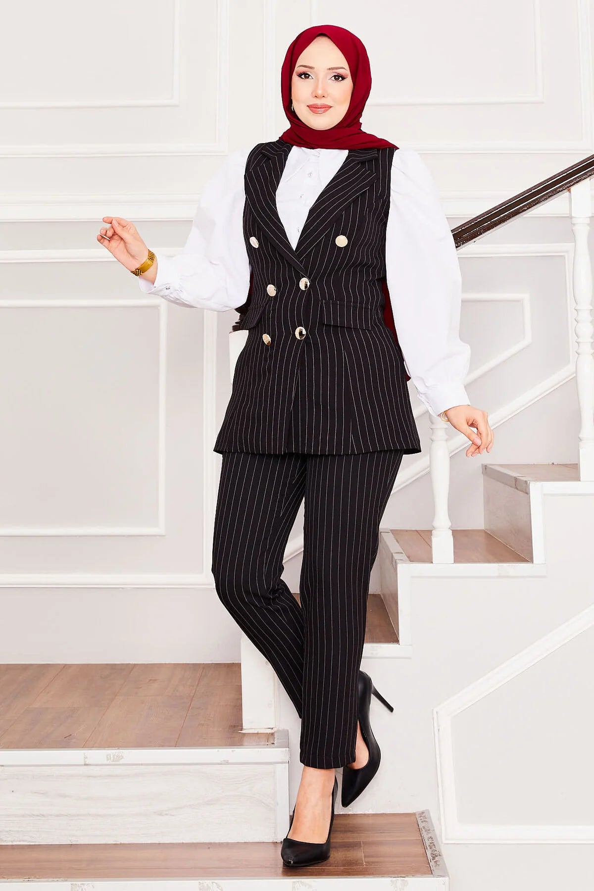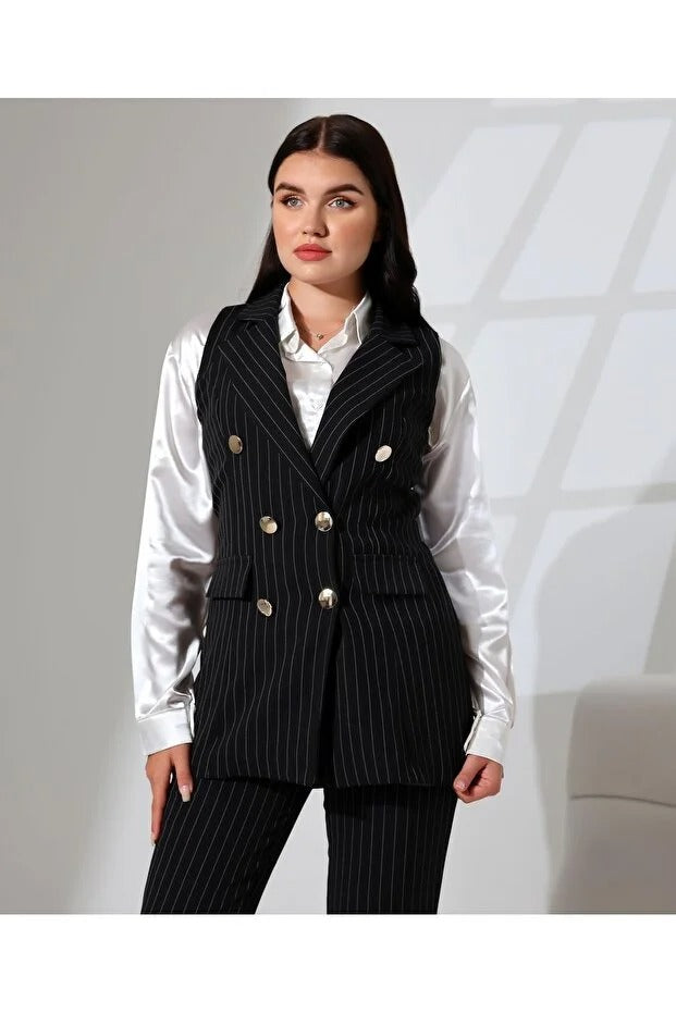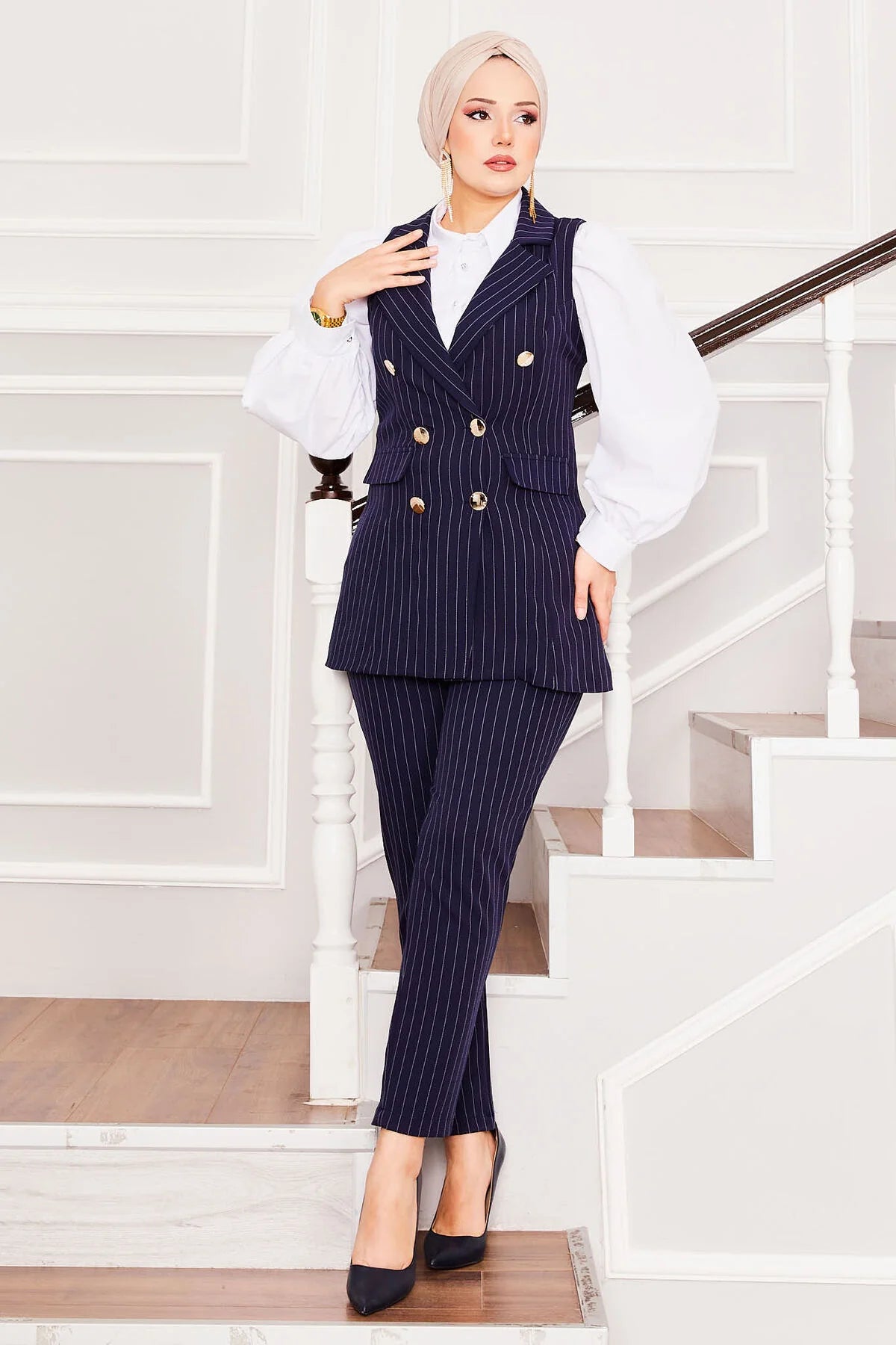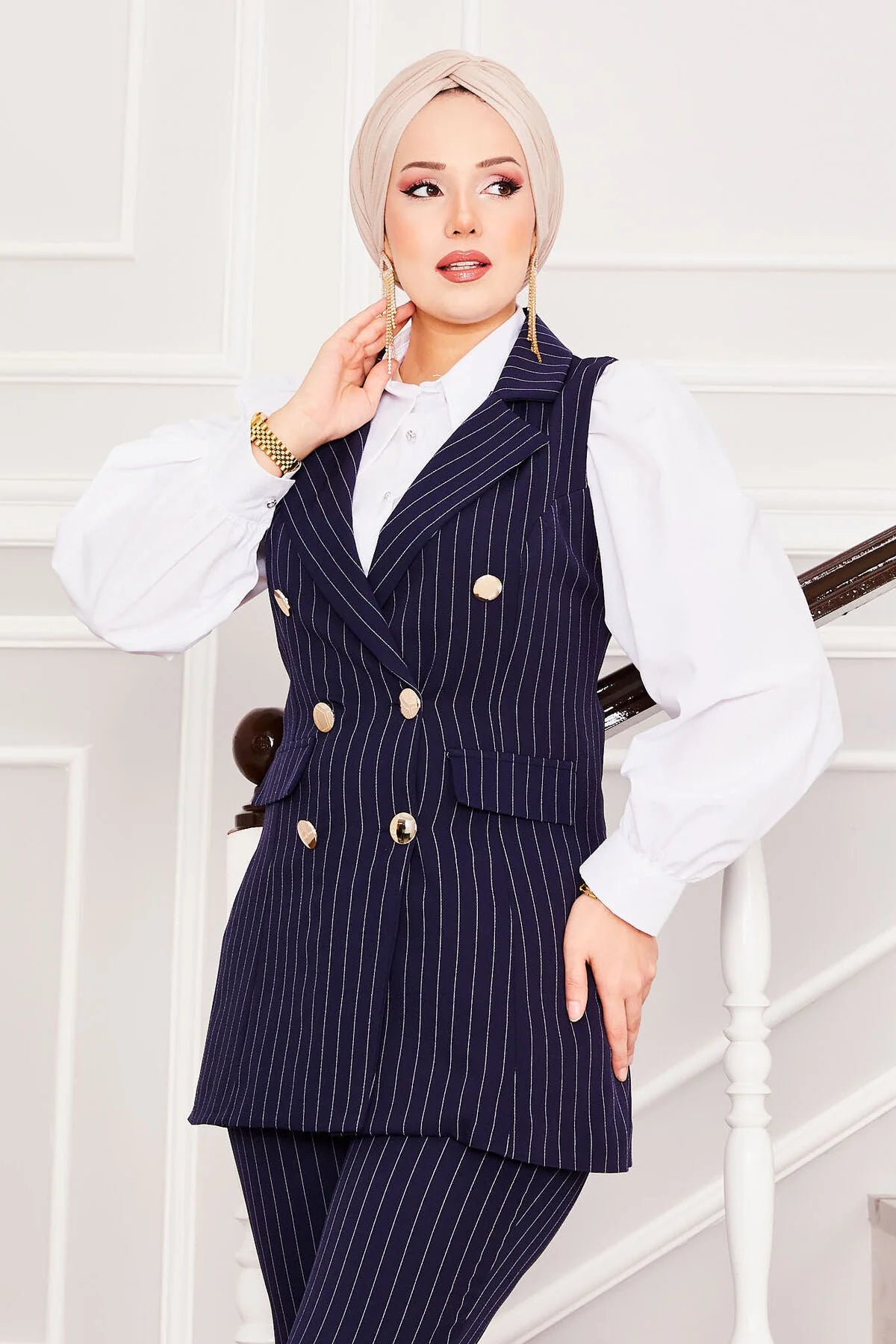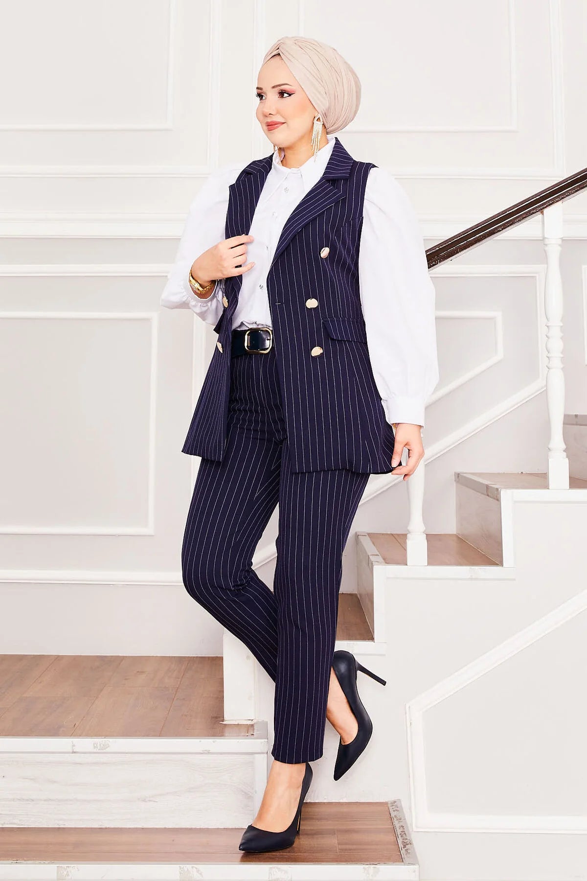 Un ensemble tailleur rayé au style audacieux, composé d’un pantalon parfaitement ajusté et d’un gilet chic qui redéfinit la féminité moderne.